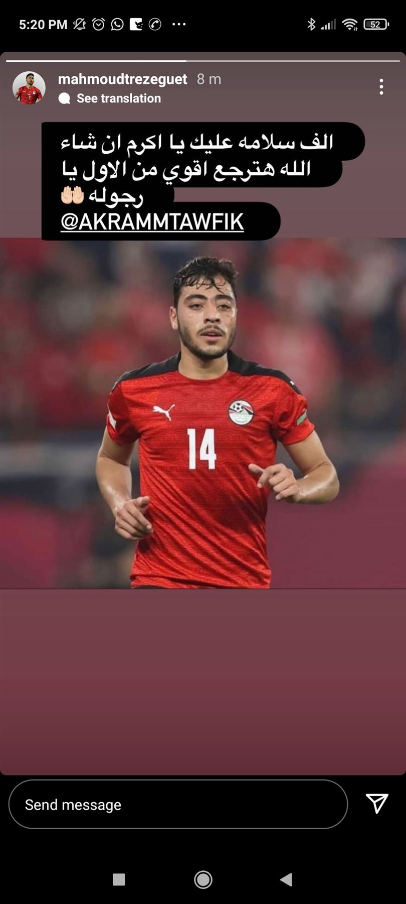 نشر اللاعب محمود تريزيجية صورة للاعب اكرم توفيق لاعب النادي الأهلي ومنتخب مصر عبر قصته علي موقع التواصل الاجتماعي انستجرام.