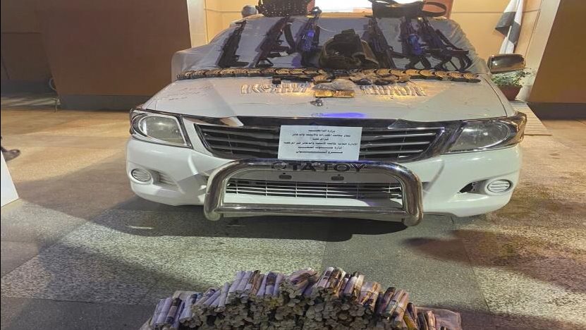 عقب تقنين الإجراءات بالتنسيق مع قطاعى (الأمن الوطنى – الأمن العام) وبالإشتراك مع قطاع الأمن المركزى ومديرية أمن أسوان، تم إستهدافهما وأمكن ضبط أحدهما أثناء إستقلاله إحدى السيارات "بدون لوحات معدنية" قيادة المتهم الآخر الذى لاذ بالفرار، كما عُثر بداخل السيارة المشار إليها على (6 بنادق آلية – طبنجة بالخزينة الخاصة بها – عدد من الطلقات مختلفة الأعيرة – 23 خزينة حديدية فارغة – كمية من مخدر البانجو وزنت 22 كيلو جرام – كمية من مخدر الأفيون – كمية من مخدر الحشيش – 875 قرص لعقار الكبتاجون المخدر – 240 قرص لعقار التامول المخدر – مبلغ مالى – هاتف محمول ) .