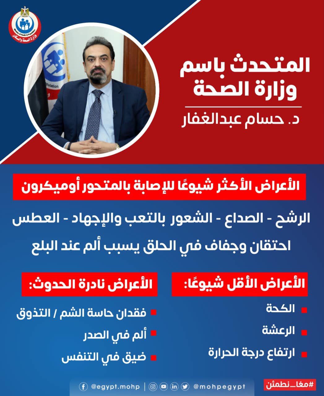 نشر الدكتور حسام عبدالغفار ، المتحدث باسم وزارة الصحة والسكان منشورا توضيحيًا عن أبرز الأعراض الأكثر والأقل شيوعا لمتحور “ أوميكرون ”.