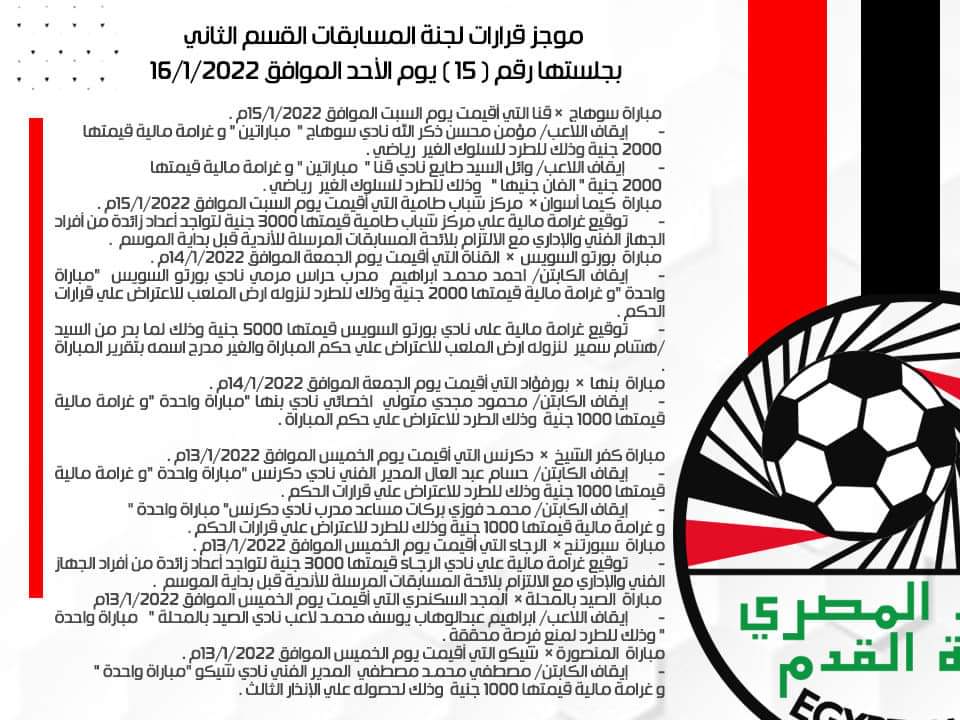 - توقيع غرامة مالية علي مركز شباب طامية قيمتها 3000 جنية لتواجد أعداد زائدة من أفراد الجهاز الفني والإداري مع الالتزام بلائحة المسابقات المرسلة للأندية قبل بداية الموسم .