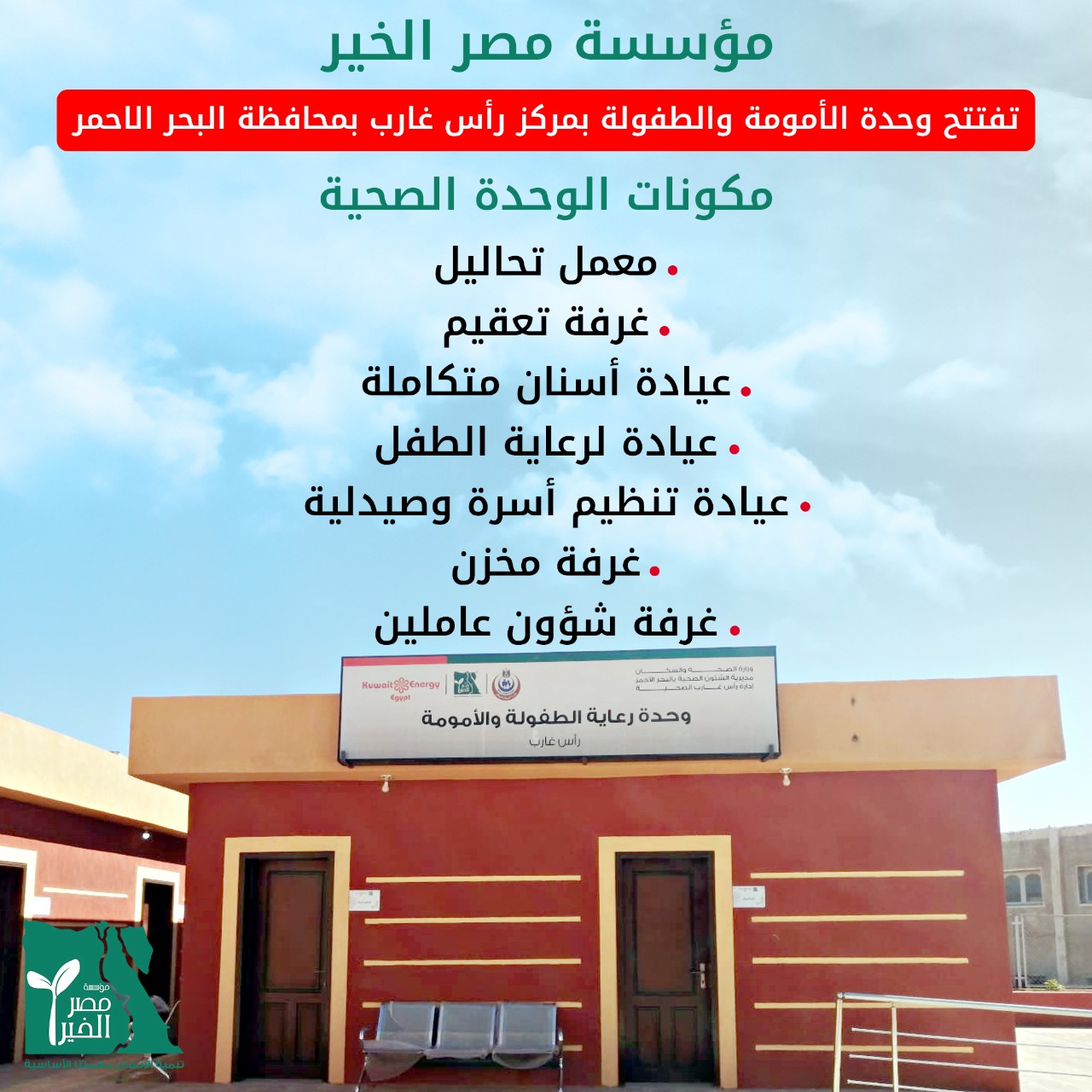 تفتتح مؤسسة “مصر الخير”، غدا الأحد، الوحدة الصحية للأمومة والطفولة بمركز رأس غارب بمحافظة البحرالأحمر، وذلك بتعاونمع شركة "كويت إنيرجى إيجيبت" حيث يتم الافتتاح في إطار الاحتفالات التي تشهدها محافظة البحر الأحمر، وذلك تزامنا مع عيدها القومي الذي يوافق يوم 22 يناير من كل عام.