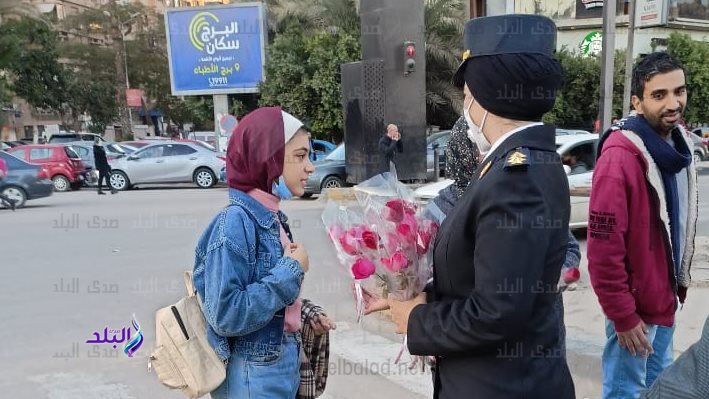 وحرص ضباط الشرطة على توزيع الورود والحلوي علي المواطنين في الشارع، مع توزيع كتيب إرشادي داخل سيارتهم المتنقلة.