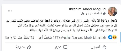 نعى الكاتب والروائي الكبير إبراهيم عبد المجيد، الكاتب الصحفي ياسر رزق الذي توفي صباح اليوم، إثر تعرضه لأزمة قلبية.