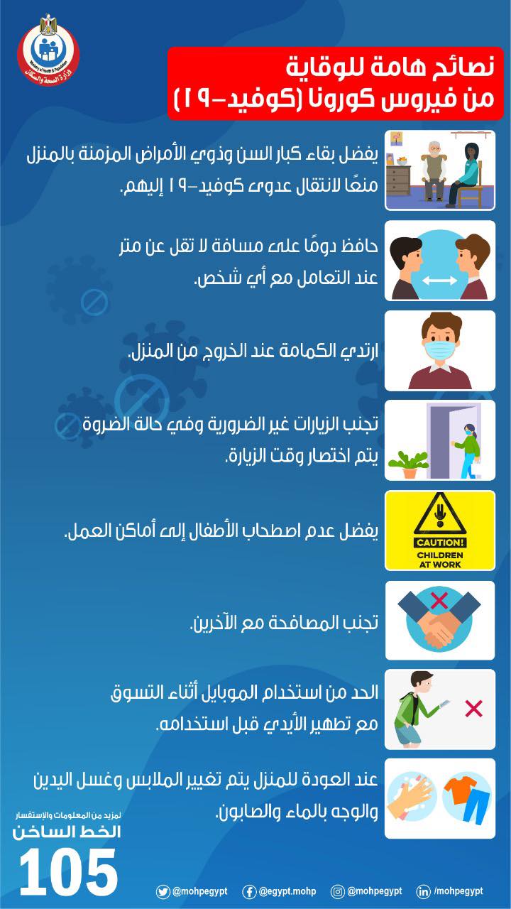 لتجنب الإصابة بفيروس كورونا… نشرت وزارة الصحة والسكان مجموعة من الإرشادات والإجراءات العامة للمواطنين ، لمنع إصابتهم بفيروس كورونا المستجد والتي كان من أبرزها : -