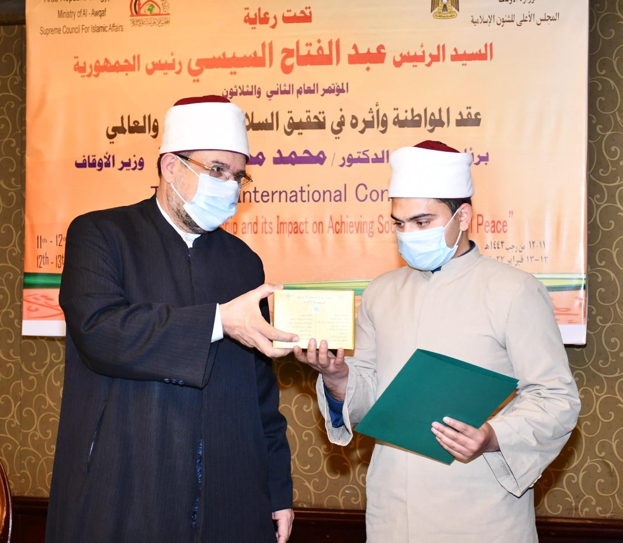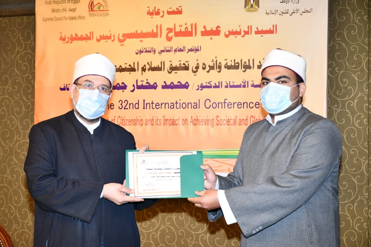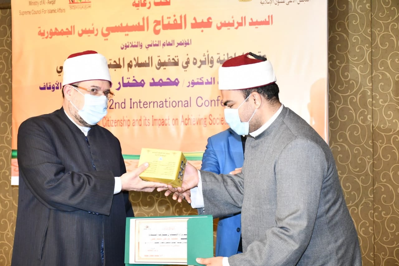 كرم الدكتور محمد مختار جمعة، وزير الأوقاف، ثلاثة أوائل في مسابقة الكتاب والمؤلفين والمصادر العلمية وهم“الشيخ محمد حلمي عبد المولى علي، إمام وخطيب ومدرس بوزارة الأوقاف، والشيخ محمد مرعي سيد علي، إمام وخطيب ومدرس بوزارة الأوقاف، والدكتور رأفت عبدالستار سيد أحمد - المدرس المساعد بكلية أصول الدين جامعة الأزهر بالمنصورة”.