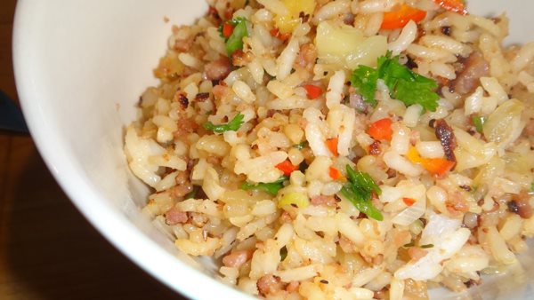 ١. حولي الأرز إلى أرز مقلي. سخني بعض الزيت في مقلاة واطهي الثوم والبصل والزنجبيل ليصبح لونهم شبه شفاف. أضيفي الخضروات، مثل: الجزر والبازلاء، بالإضافة لملعقة كبيرة من صوص الصويا حسب الرغبة. أضيفي ملعقة كبيرة من الأرز في نفس الوقت وقلبيه كثيرًا وسيكون جاهزًا عند الانتهاء من طهيه باكمله.