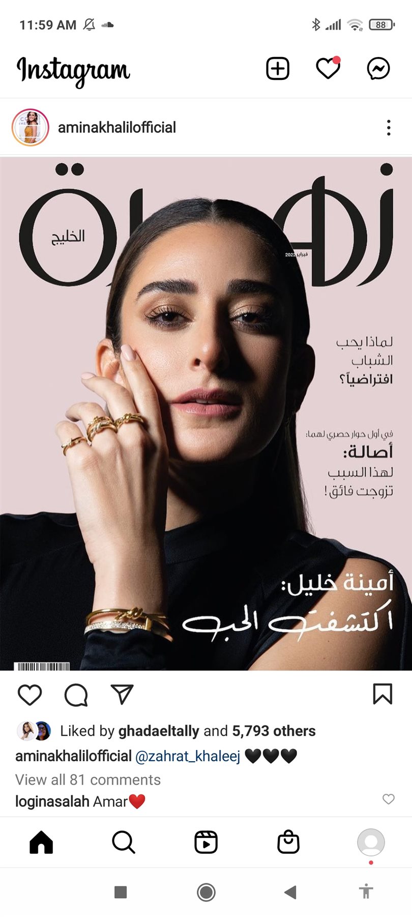 وظهرت أمينة خليل ، متصدرة غلاف مجلة زهرة الخليج الإماراتية ، بإطلالة انيقة، مما أثار إعجاب متابعيها.