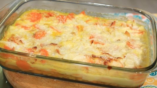 5-يُقلب المزيج ويُسكب في منتصف صينية الخبز وتخبز لمدة 25 دقيقة أو حتى تنضج البطاطا