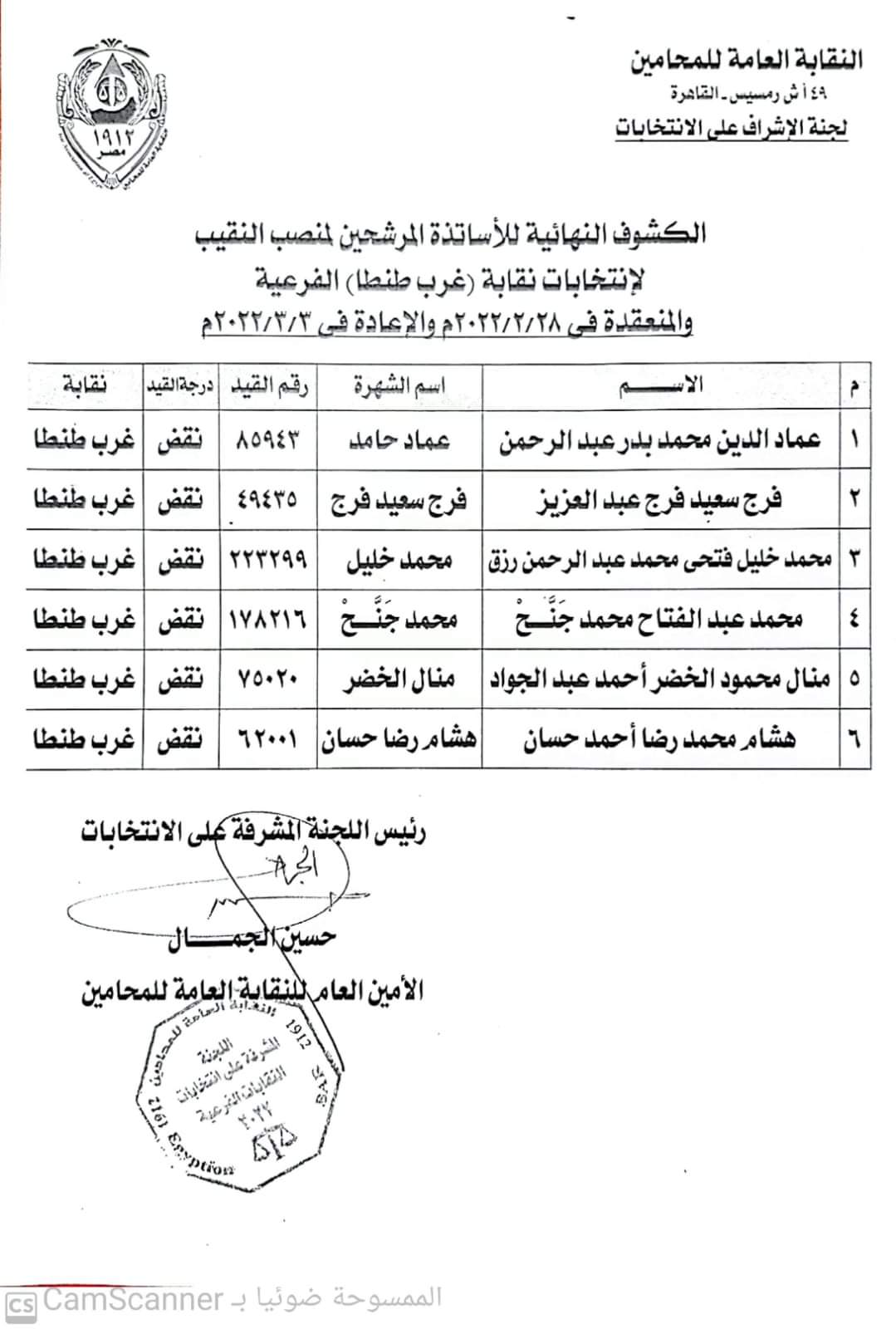 وطبقا للكشف المرفق، فإن المرشحين على منصب نقيب غرب طنطا هم؛ عماد حامد، وفرج سعيد فرج، ومحمد خليل، ومحمد جَنح، والأستاذة منال الخضر، وهشام رضا حسان.