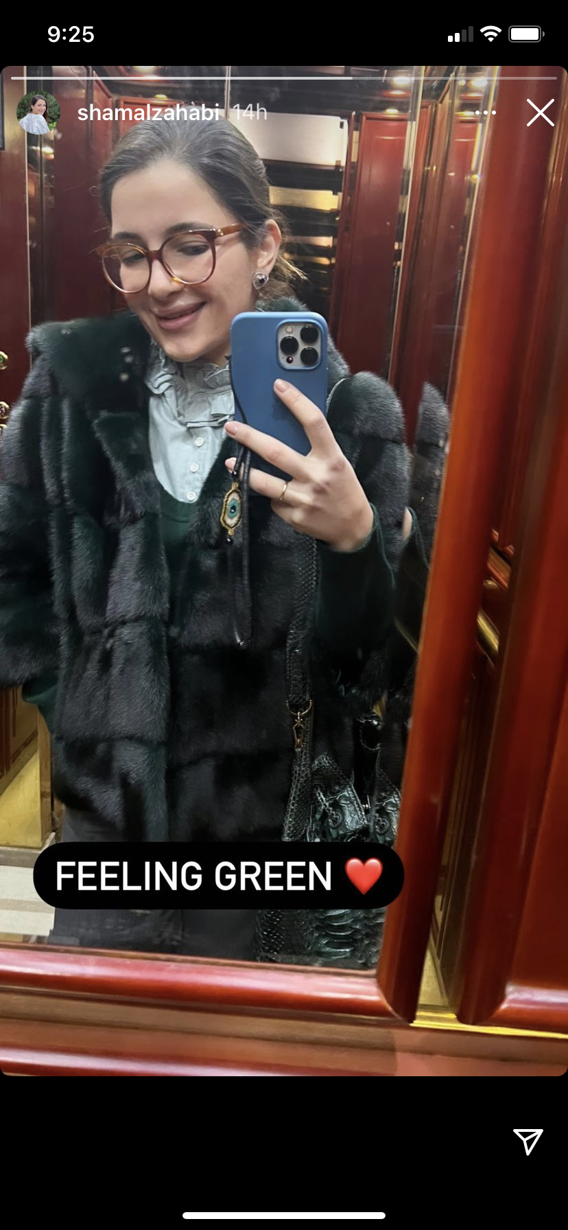 وظهرت شام الذهبي في الصورة بإطلالة شتوية من المصعد مما أثار إعجاب متابعيها.