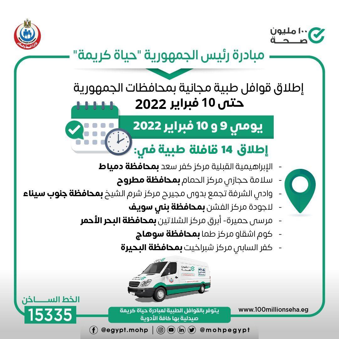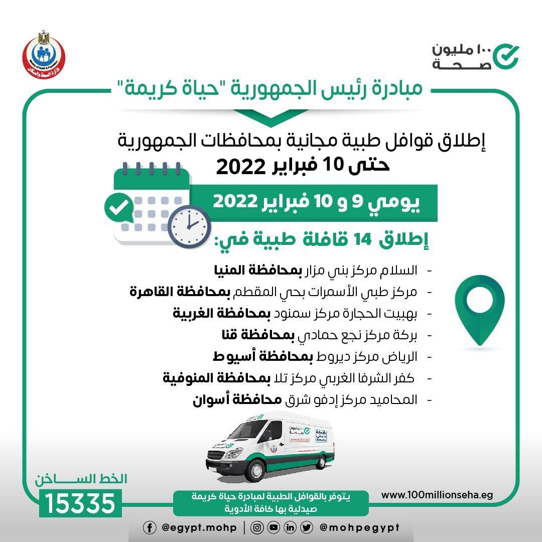 أعلنت وزارة الصحة والسكان، إطلاق 14 قافلة طبية ضمن مبادرة الرئيس عبد الفتاح السيسي “حياة كريمة”، يومي 9 و 10 فبراير 2022 للكشف والعلاج مجانًا.