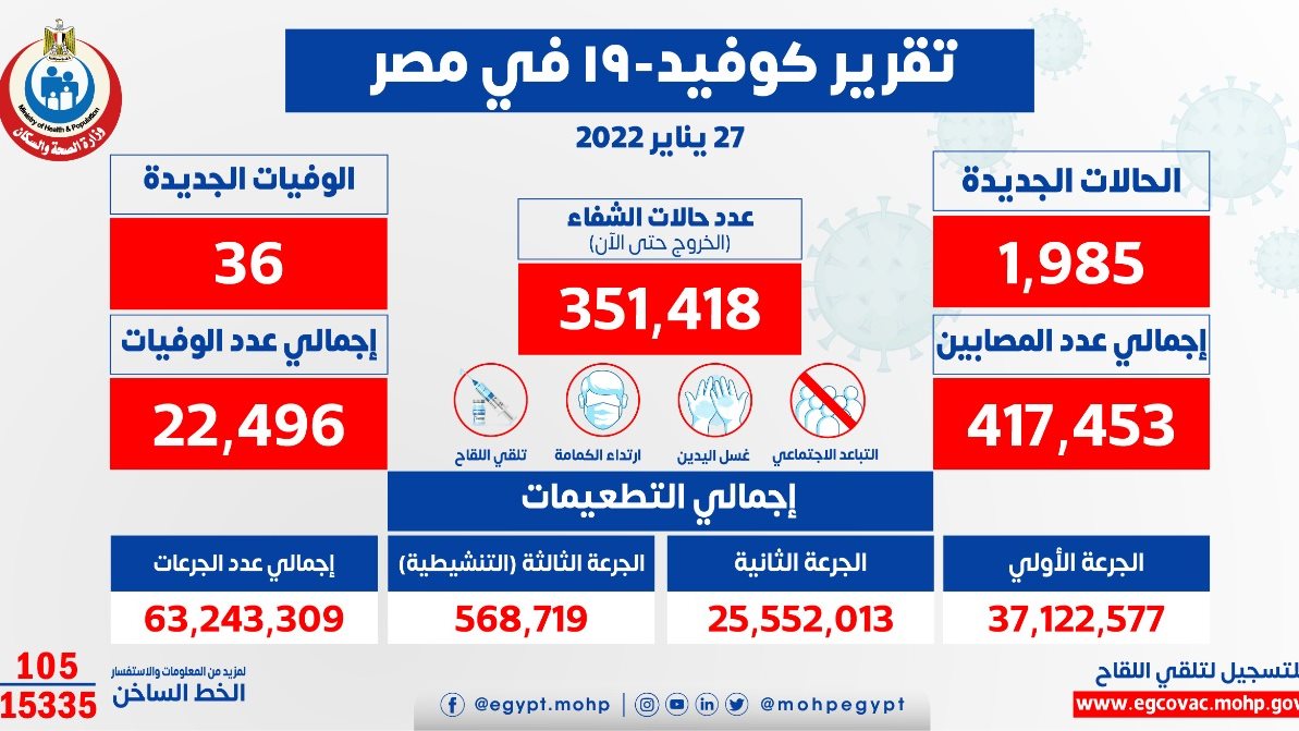 أعلنت وزارة الصحة والسكان ، عن تلقي 38 مليوناً و190 ألفًا 229 مواطناً للجرعة الأولى من لقاح كورونا حتى الآن بكافة النقاط المخصصة .