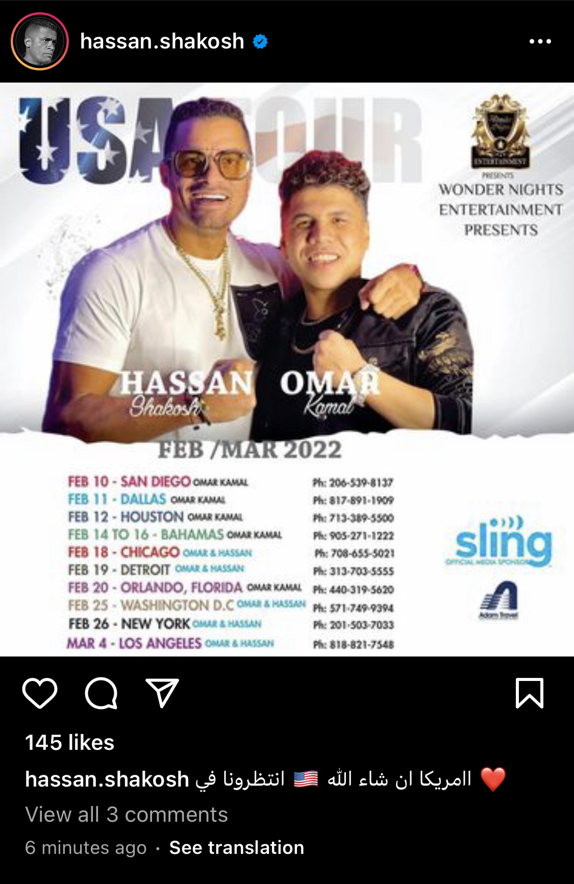 روج مطرب المهرجانات حسن شاكوش، لحفله الغنائي بصحبه المطرب عمر كمال في أمريكا، عبر حسابه الشخصي بموقع التواصل الاجتماعي “انستجرام”.
