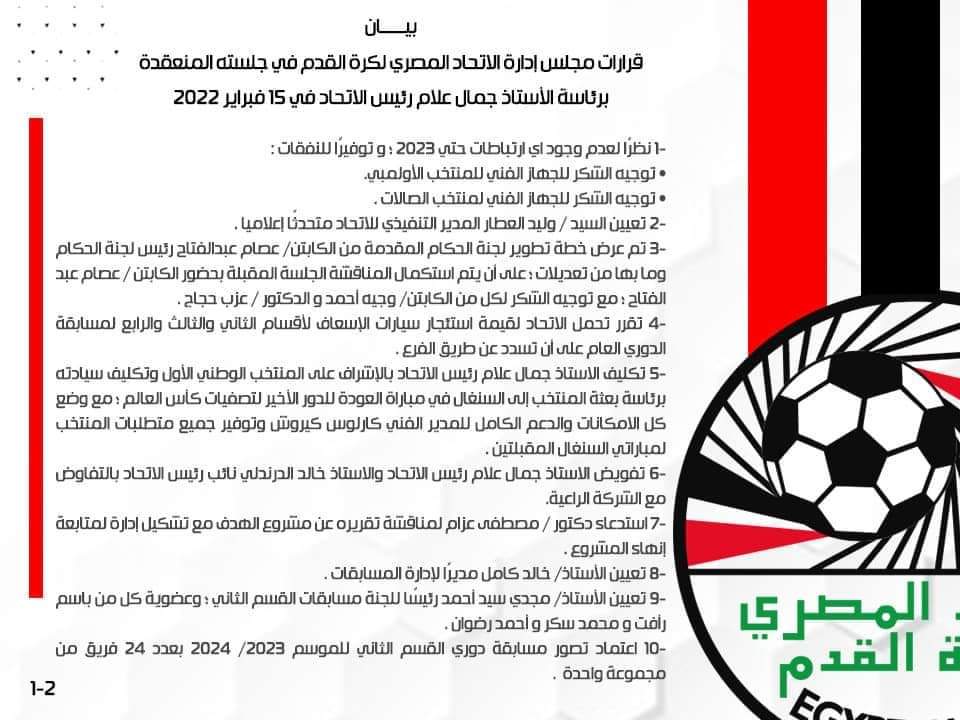 3- تعيين جمال علام رئيس الاتحاد مشرفا على المنتخب، ورئاسته للبعثة المسافرة للسنغال لمواجهة منتخبها في إياب تصفيات كأس العالم.