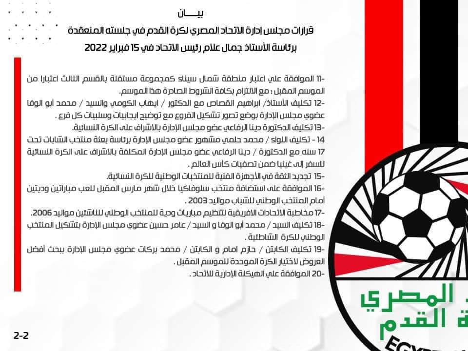 أعلن الاتحاد المصري لكرة القدم، بعد انعقاد أول اجتماع لمجلس الإداراة، للمرة، عن 20 قرارا في العديد من القضايا المهمة.