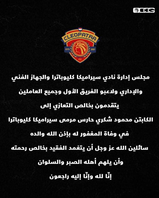 تقدم نادي سيراميكا كليوباترا بالتعازي إلى الكابتن محمود شكري حارس مرمى الفريق الاول لكرة القدم في وفاة والده.