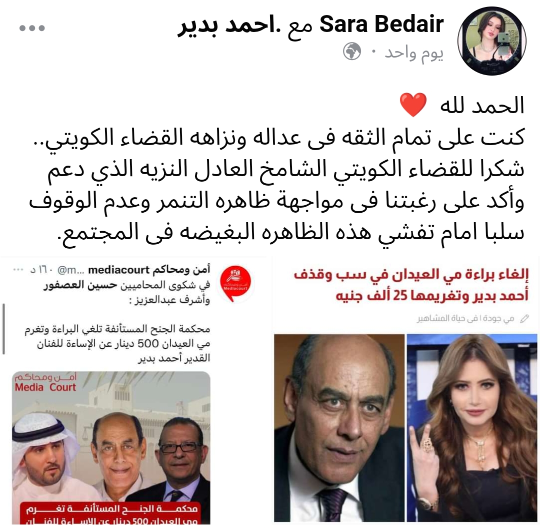 وكتبت ابنة أحمد بدير ، في منشورها عبر فيسبوك: «الحمد لله .. كنت على تمام الثقه فى عداله ونزاهه القضاء الكويتي.. شكرا للقضاء الكويتي الشامخ العادل النزيه الذي دعم وأكد على رغبتنا فى مواجهة ظاهره التنمر وعدم الوقوف سلبا امام تفشي هذه الظاهره البغيضه فى المجتمع».