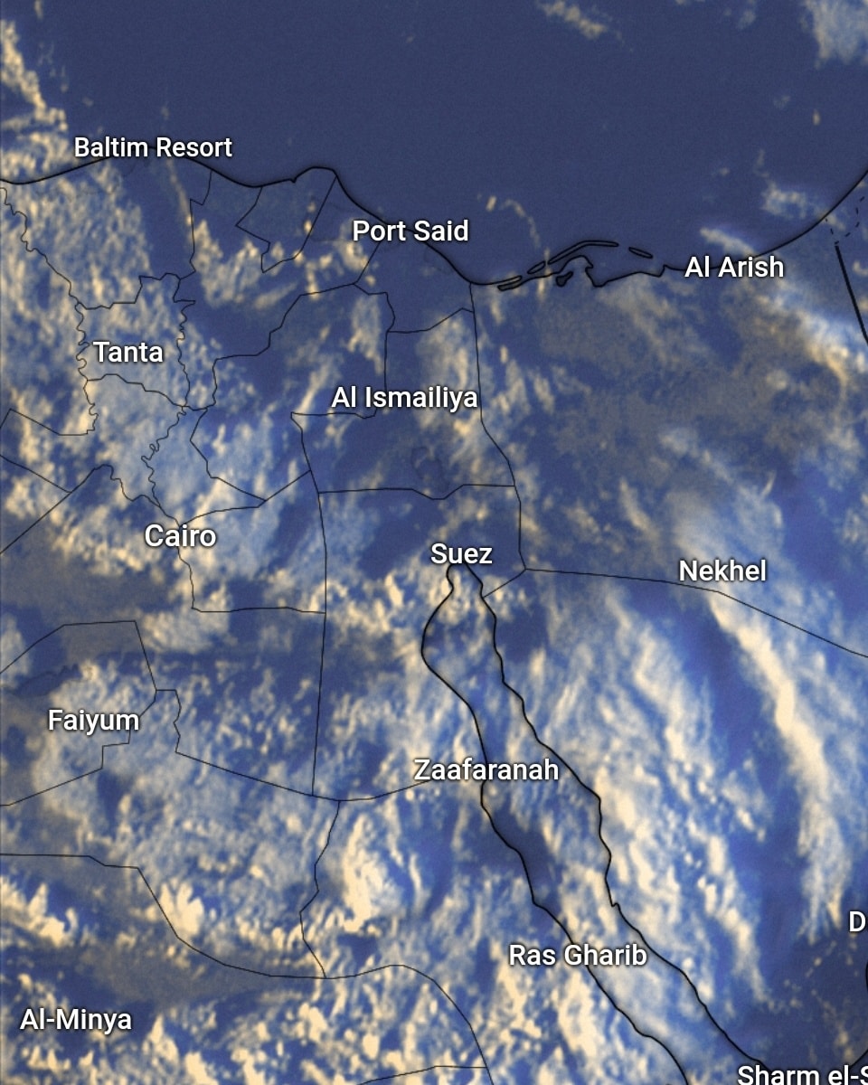 ونشرت هيئة الأرصاد، بعد ظهر اليوم، السبت، صورا أيضا لتكاثر السحب الرعدية على المدن المطلة على خليج السويس ( الزعفرانة - أبو زنيمة - رأس سدر) ومناطق من سيناء، يصاحبها سقوط أمطار متوسطة تغزر أحيانا تصل الى حد السيول أحيانا.