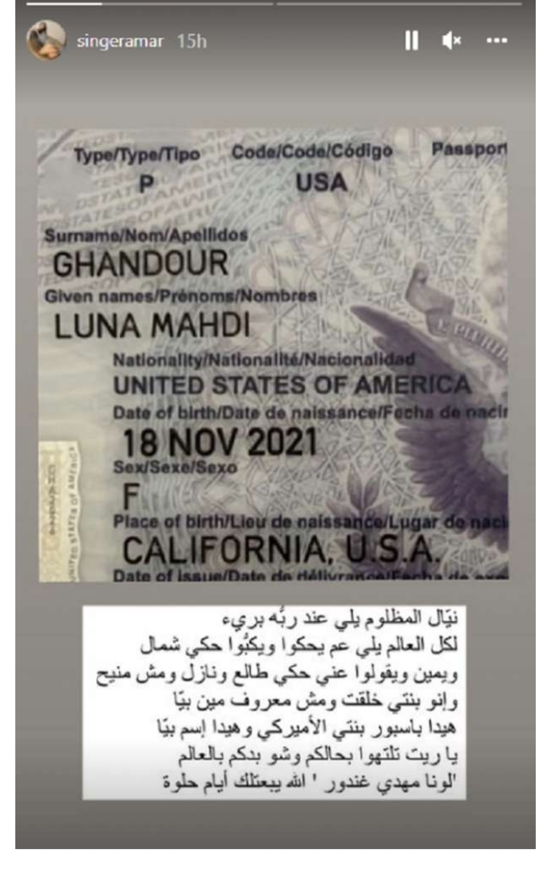 ونشر قمر عبر حسابها الرسمي بموقع الصور والفيديوهات الشهير «انستجرام»، صورة من جواز السفر الأمريكي الخاص بابنتها وعلقت: «هنيئا للمظلوم اللي عند ربه بريء، لكل الناس اللي عم يحكو ويكبو حكي شمال ويمين ويقول عني حكي طالع نازل ومش منيح وإنو بنتي خلقت ومش معروف مين والدها».