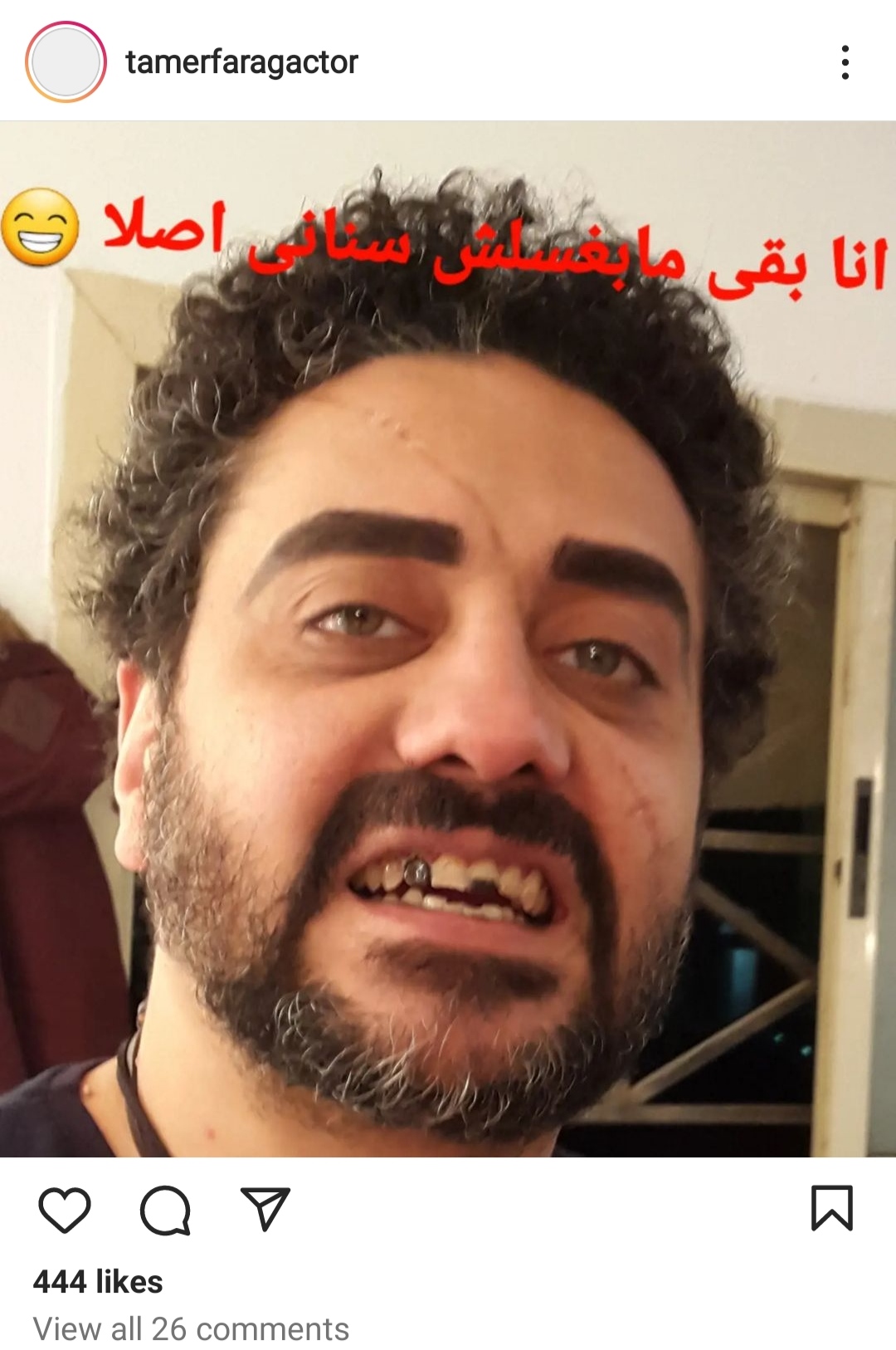 وظهر تامر فرج في الصورة مبينا أسنانه، معلقا "انا بقي مبغسلش سناني اصلا".