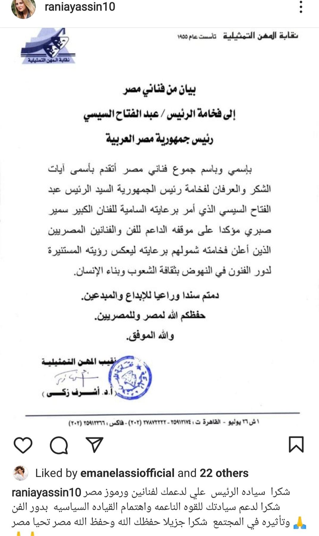 وكتبت رانيا ياسين"شكرا سيادة الرئيس علي لدعمك لفنانين ورموز مصر، شكرا لدعم سيادتك للقوة الناعمة واهتمام القيادة السياسية بدور الفن، وتأثيره في المجتمع شكرا جزيلا حفظك الله وحفظ الله مصر تحيا مصر".