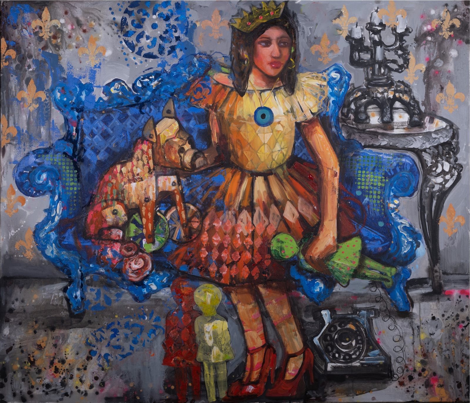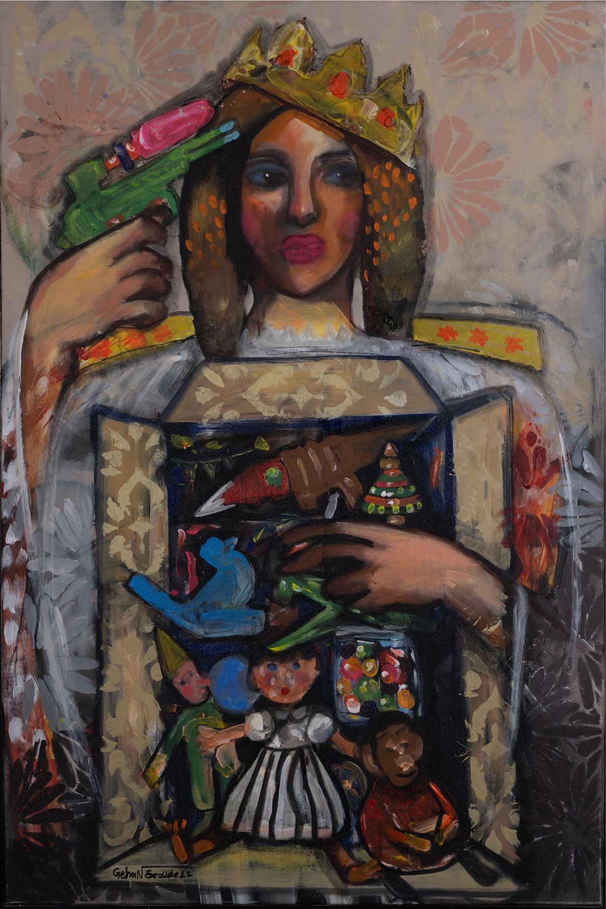 عبر 24 لوحة تُعبر الفنانة جيهان سعودي عن هذا التباين داخلنا حين تتقابل في لحظات درامية ذكريات البراءة مع واقعنا الناضج بفعل خبرات الحياة .. مشاهد تُعيد فيها رسم ما علق بذهنها أو مازال بصندوق ألعابها القديم في بيئة واقعية مشاعرها وأفكارها الآنية .. كيف هو المشهد؟ هل ما كان يُضحكنا سيظل يُضحكنا؟ هل الشغف بالدُمي والعرائس وحالة الونس والألفة معهم يُمكن أن نكتفي بها في هذا العالم؟ وماذا عن الأمان في بيت ألعابنا ونحن نحتضن صندوق الدُمي ذات الفستان الأبيض والبهلوانات والمكعبات والبلورات الملونة ...؟ هل ستتناغم هذه الذكريات الآن مع طعم القهوة الذي حل محل ذلك الشاي من الإبريق البلاستيكي الفارغ؟ .. فوق مسطح جيهان سعودي حضر الجميع هذه المقابلة الشخصية لمراجعة دروس قديمة لم تستوعبها إلا اليوم الذي يُشبه النحلة الدوارة لكن بلا خيوط ولا يُبالي بالآخر، فلا ينجو سوى المتشبثون بها كطفل يتشبث بلعبته كما لو أنها قلبه.