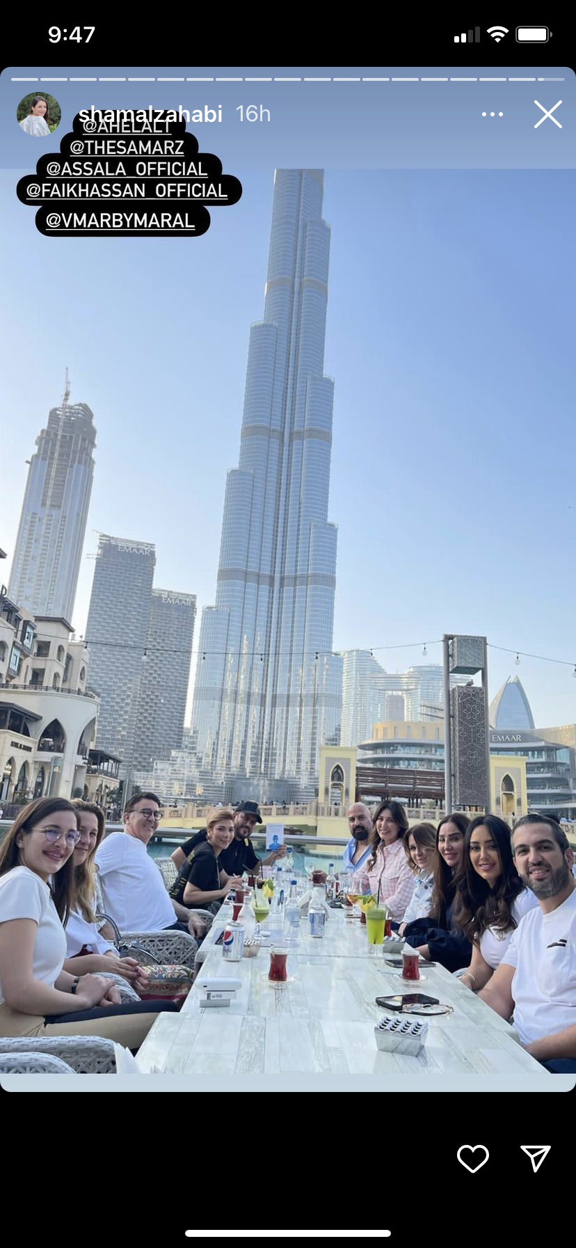 وظهرت شام الذهبي، من دبي مع خطيبها و أصالة و زوجها و أصدقائهم مما أثارت إعجاب متابعيها.