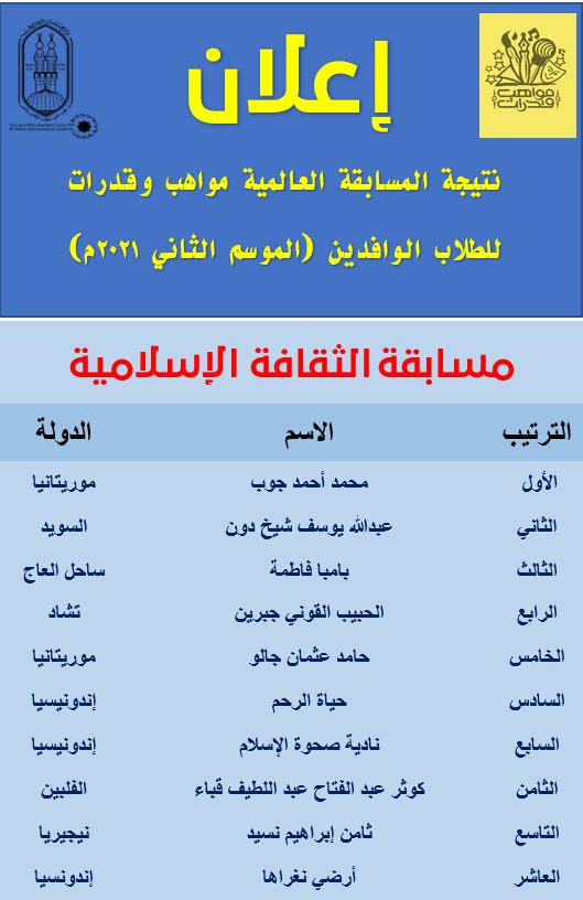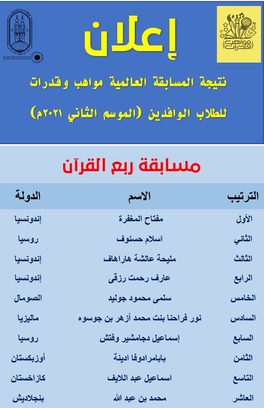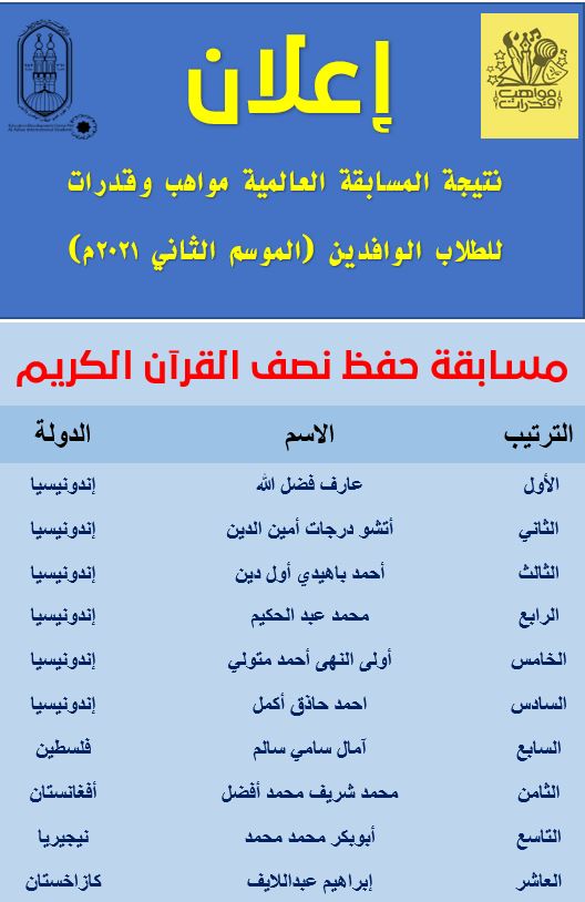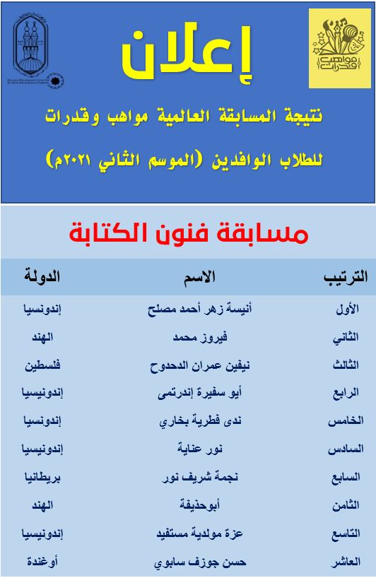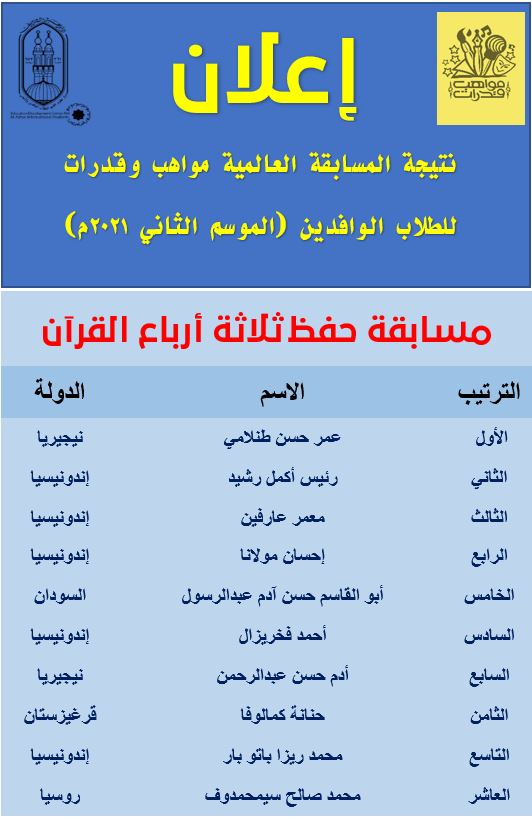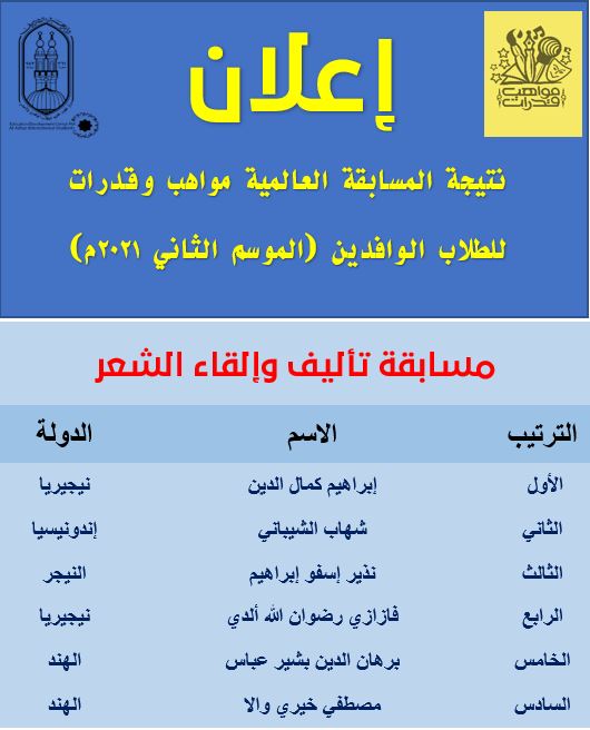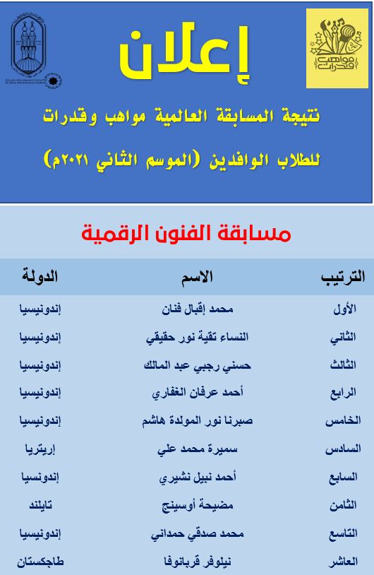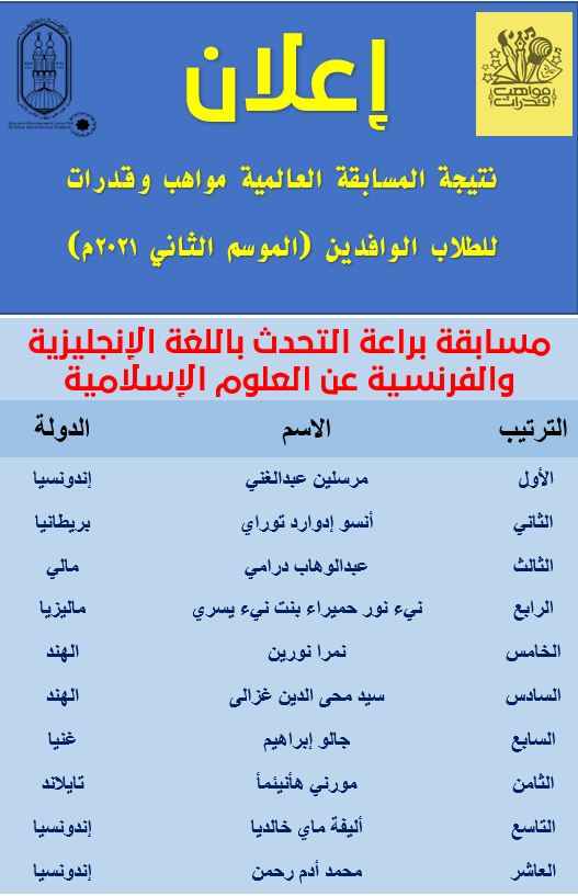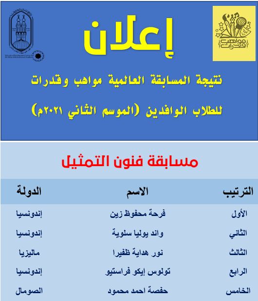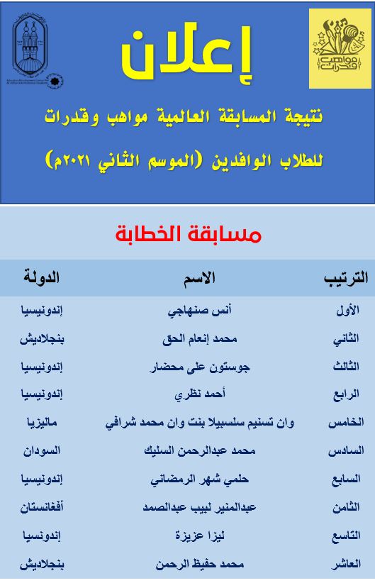 أعلن مركز تطوير تعليم الطلاب الوافدين والأجانب عن أسماء الفائزين في المسابقة العالمية للوافدين والأجانب (مواهب وقدرات) الموسم الثاني ٢٠٢١م، التي نظمها المركز، برعاية فضيلة الإمام الأكبر الأستاذ الدكتور أحمد الطيب، شيخ الأزهر، تحت شعار "تنمية واستدامة"، لجميع الطلاب الوافدين والأجانب الدارسين بجميع مراحل التعليم (ما قبل الجامعي – جامعي – دراسات عليا).