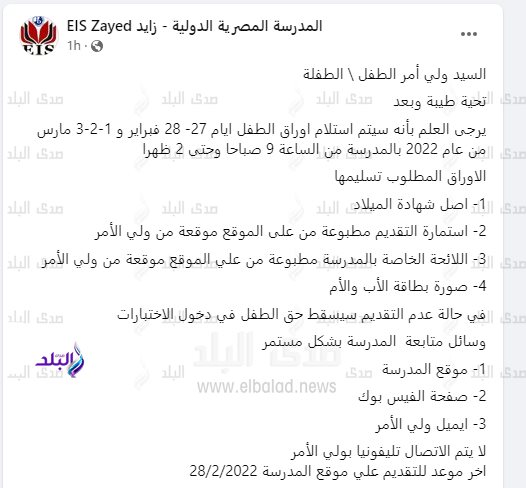 وقالت المدرسة المصرية الدولية بالشيخ زايد لـ أولياء الأمور الراغبين في التقديم لأبنائهم للالتحاق بالمدرسة العام الدراسي القادم: "يرجى العلم بأنه سيتم استلام أوراق الطفل أيام 27 - 28 فبراير و1 - 2 - 3 مارس من عام 2022، بالمدرسة من الساعة 9 صباحا وحتى 2 ظهرا.