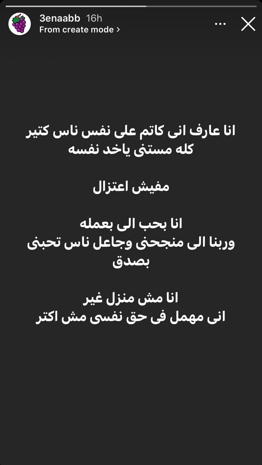 وقال مصطفى عنبة عبر خاصية الاستورى معلقا على كلمته السابقة "أنا آسف لنفسي" ليعلق مجددا : “أنا عارف إني كاتم على نفس ناس كتير كله مستني ياخد نفسه، مفيش اعتزال، أنا بحب اللي بعمله وربنا اللي منجحني وجاعل الناس تحبني بصدق، أنا مهمل في حق نفسي مش أكتر”.