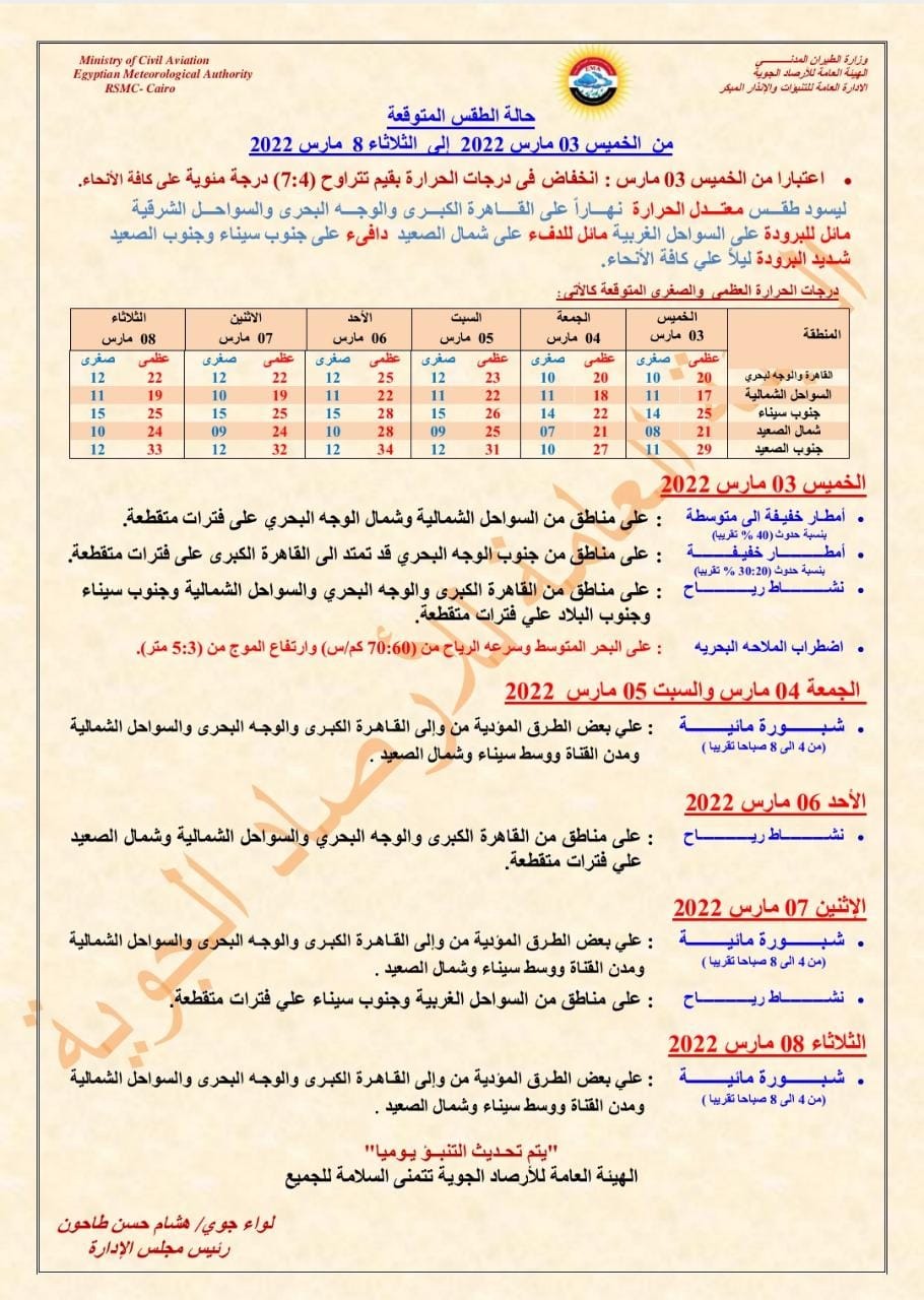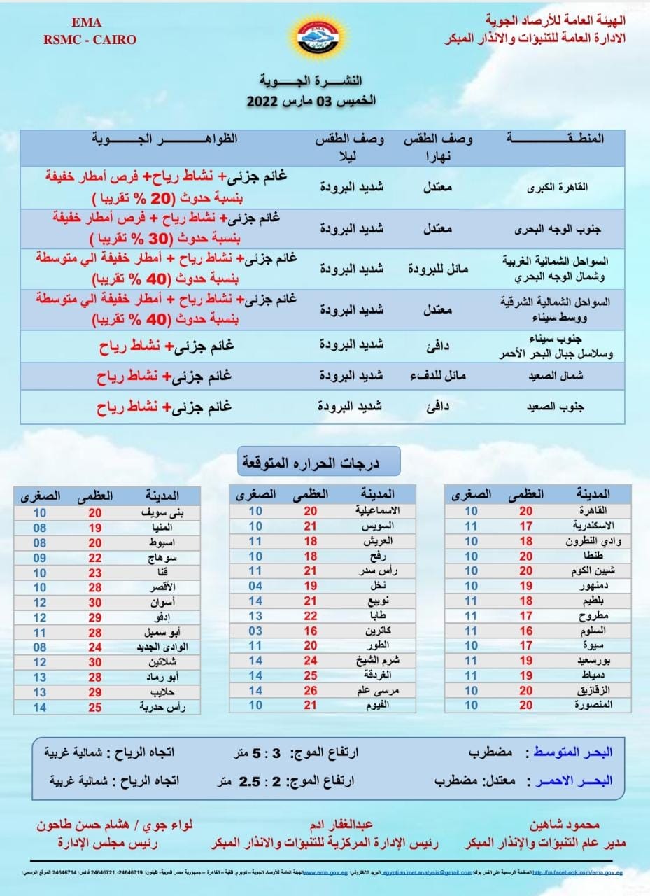 أمطار خفيفة إلى متوسطة متوقعة بنسبة 40% على مناطق من السواحل الشمالية وشمال الوجه البحري على فترات متقطعة، وأمطار خفيفة متوقعة بنسبة 20-30% على مناطق من جنوب الوجه البحري قد تمتد إلى القاهرة الكبرى على فترات متقطعة، ونشاط رياح على مناطق من القاهرة الكبرى والوجه البحري والسواحل الشمالية وجنوب سيناء وجنوب البلاد على فترات متقطعة، واضطراب الملاحة البحرية على البحر المتوسط وسرعة الرياح من 70-60 كلم/ ساعة وارتفاع الموج 3-5 أمتار.