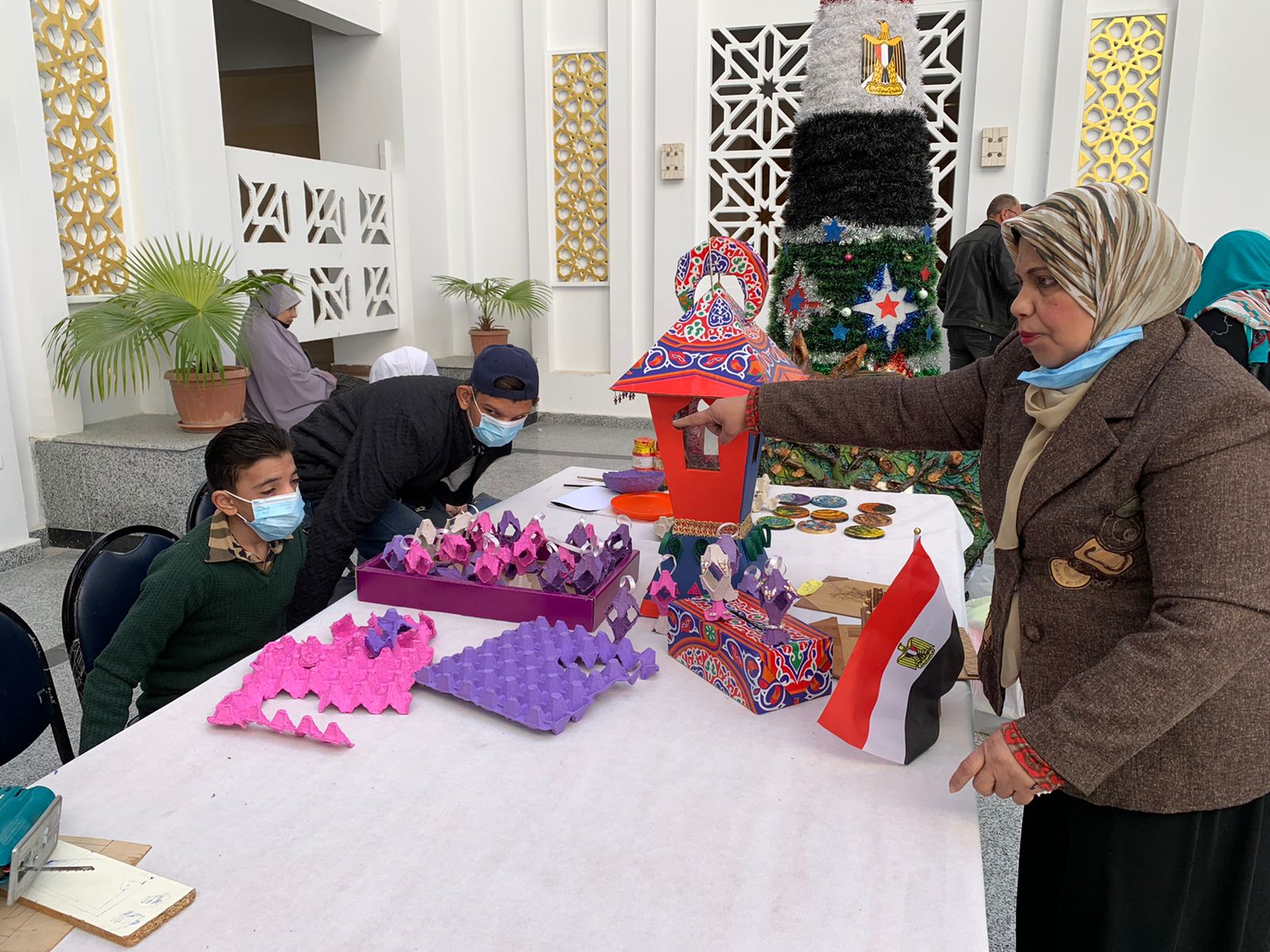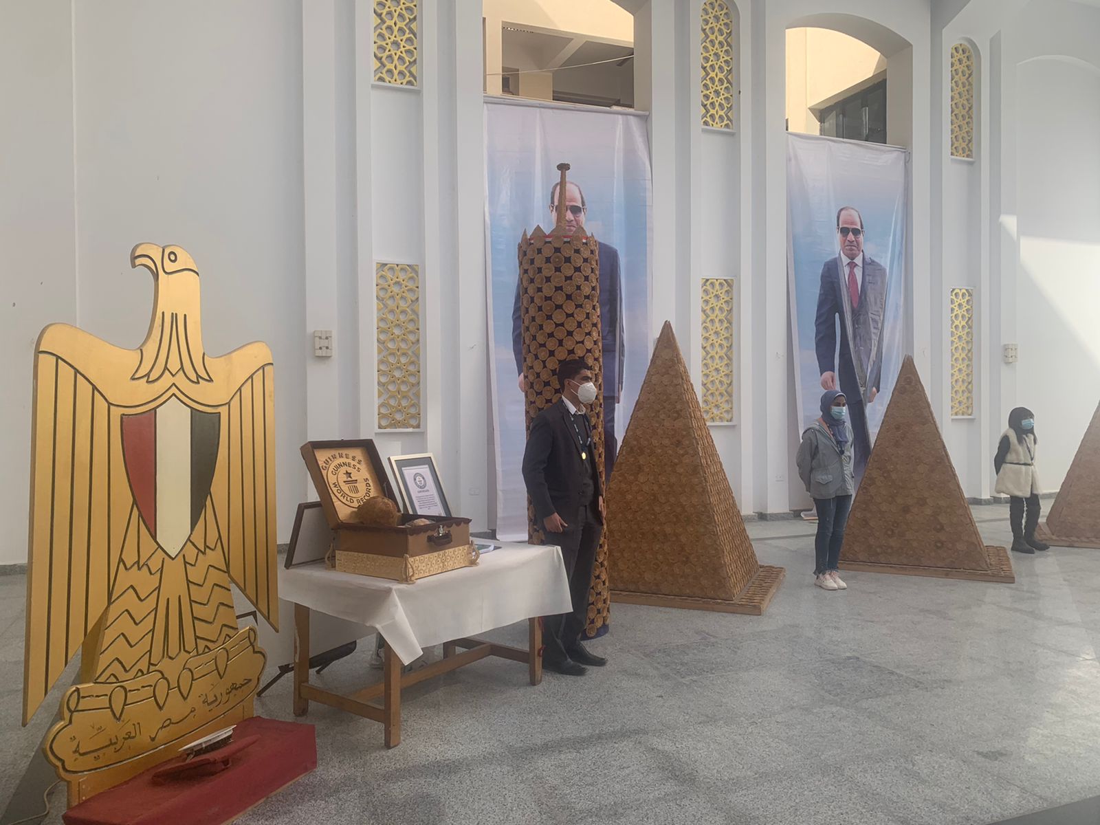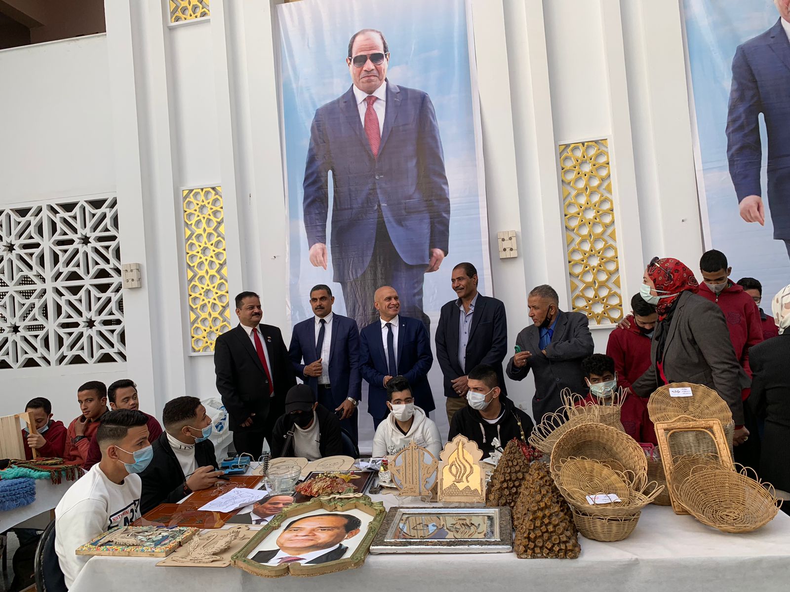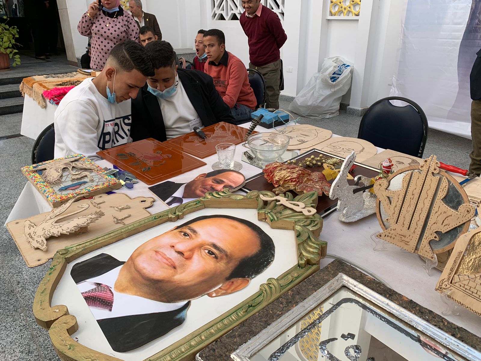 ويشمل المعرض المقام بمجمع الملك فهد في الحي السادس بمدينة نصر لوحات ومجسمات وأعمال فنية ويدوية علاوة على صور الرئيس عبد الفتاح السيسي.