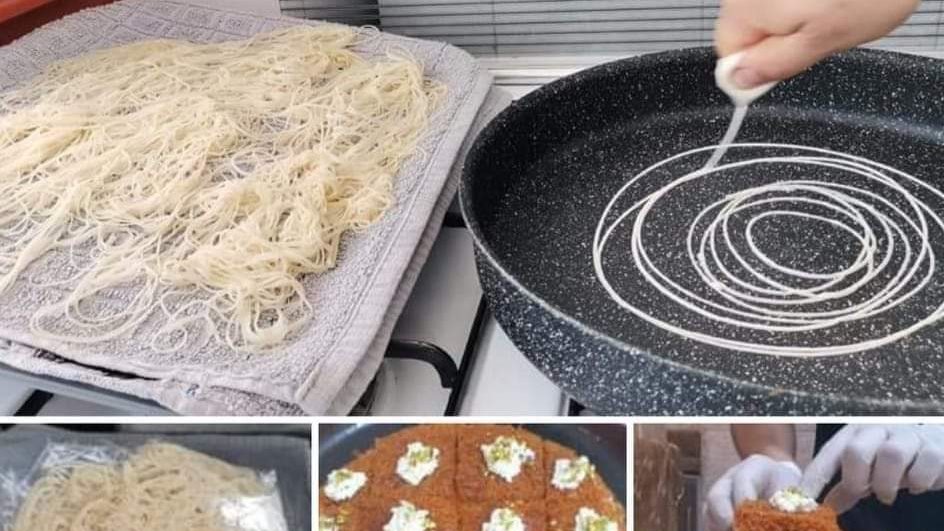 اصنعي ثقب واحد في الكيس أو غطاء الزجاجة ثم شكلي الكنافة مقلاة ساخنة ويجب أن تكون المقلاة واسعة غير لاصقة على نار متوسطة.