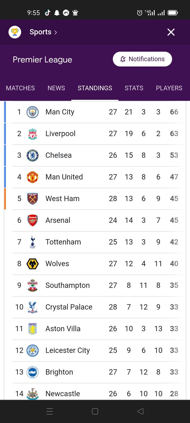 ورفع ليفربول رصيده إلى 63 نقطة في المركز الثاني بجدول الترتيب، بفارق 3 نقاط عن مانشستر سيتي المتصدر، وتوقف رصيد وست هام عند النقطة 45 في المركز الخامس.