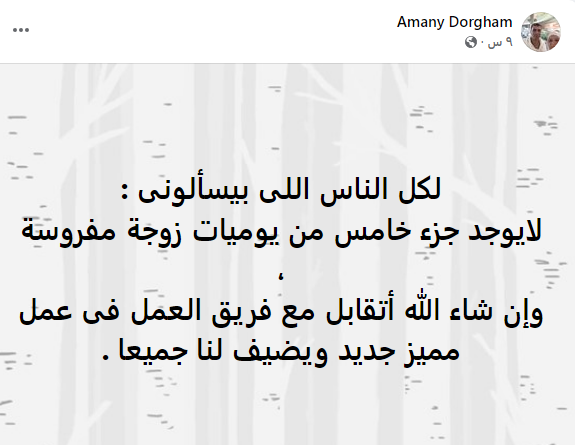 وقالت أمانى ضرغام، عبر صفحتها على موقع التواصل الاجتماعى “فيسبوك”: “لكل الناس اللي بيسألوني، لا يوجد جزء خامس من يوميات زوجة مفروسة، وإن شاء الله أتقابل مع فريق العمل، في عمل مميز جديد، ويضيف لنا جميعا”.