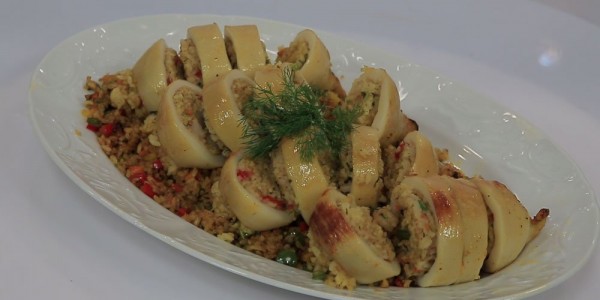 نقلي اللحمة بالزيت أو السمنة مع نصف ملعقة من كلٍّ من الملح والفلفل الأسود ونحرك حتى تنضج اللحمة ثم نضيف الصنوبر ونحرك وبذلك تكون الحشوة جاهزة.