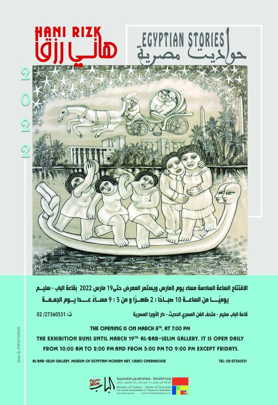 يفتتح الدكتور خالد سرور رئيس قطاع الفنون التشكيلية، معرض "حواديت مصرية" للفنان هاني رزق وذلك في تمام الساعة السابعة مساء يوم الثلاثاء 8 مارس بقاعة الباب/ سليم ساحة متحف الفن المصري الحديث بدار الأوبرا، ويستمر العرض حتى 19 مارس.