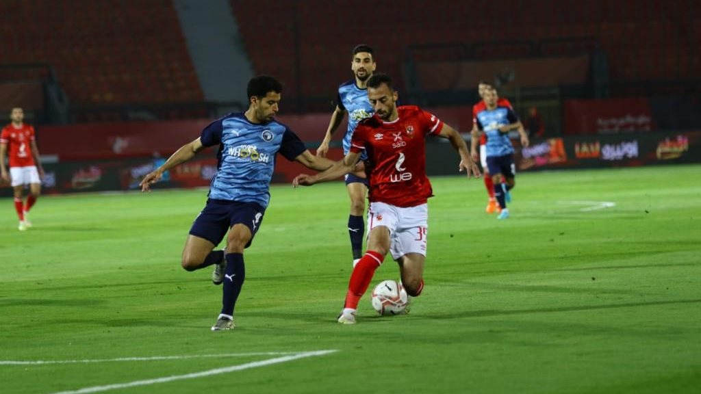 وصل بيراميدز على حدود منطقة جزاء الأهلي في هجمة عنترية بطلها محمد حمدي الذي تقدم وسدد كرة قوية ولكن علت المرمى.