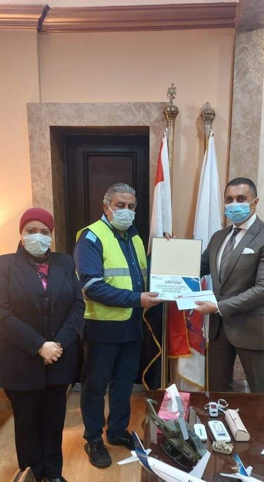 وتوجه مدير مبني الركاب رقم 1 الملاح أشرف حافظ، نيابة عن المحاسب مجدى اسحق رئيس مجلس إدارة شركة ميناء القاهرة الجوى بالشكر للعامل الأمين وقدم له شهادة تقدير ومكافأة مالية مثنيا علي أمانته وحسن خلقه، متمنياً ليه دوام التوفيق.