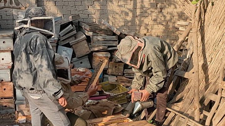 "صدى البلد" انتقل إلى موقع مناحل عسل النحل لرصد مراحل تربية النحل وتجميع مكونات الخلايا التي احتوت على الشمع و البروبليس وحبوب اللقاح الناتجة عن تحرك النحل في أسراب جماعية للزهور الموالح والبرسيم وغيرها .