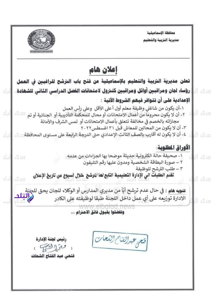 أعلنت مديريات التربية والتعليم، عن فتح باب الترشح للعمل رؤساء لجان ومراقبين أوائل ومراقبين كنترول في امتحانات الشهادة الإعدادية 2022 “الترم الثاني”.