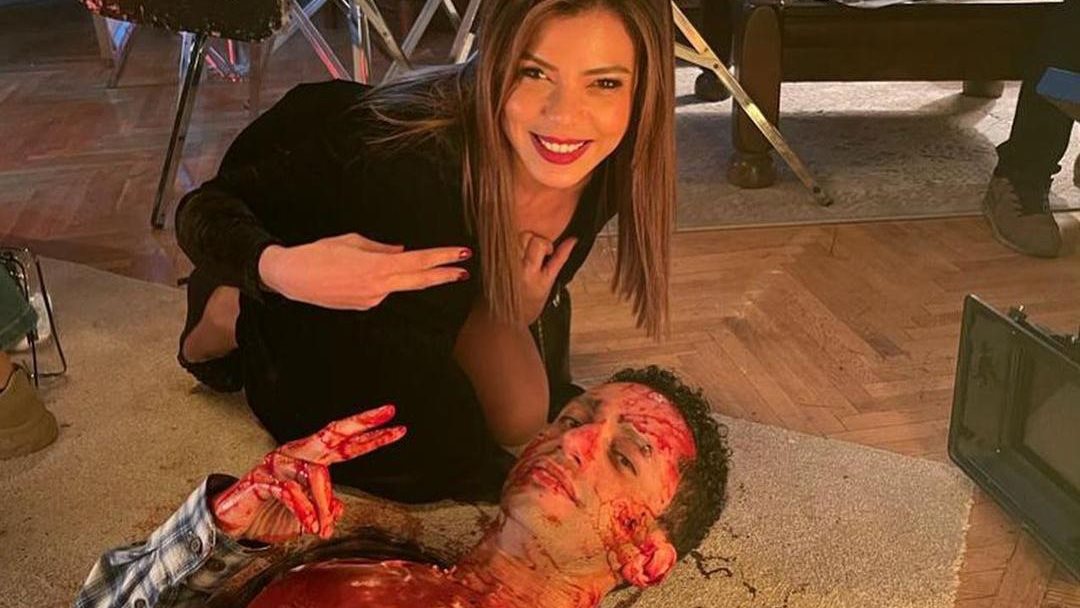 وظهرت رفقة الممثل محمد حاتم من الكواليس لمشهد دموي، وشوقت الجمهور للأحداث، وكتبت: “تفتكروا مين قتل مهاب”.