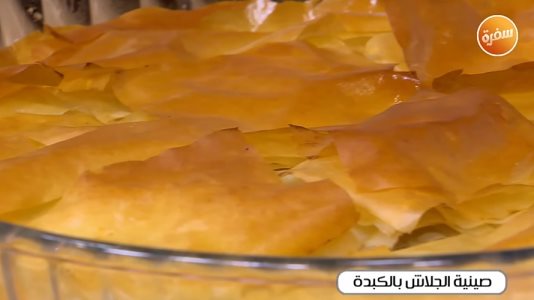 2- يتم لف ؤرق الجلاش ويتم وضعه في البايركس و تضاف السمن على الوجه و توضع في الفرن حتى تمام النضج و يضاف الشربات