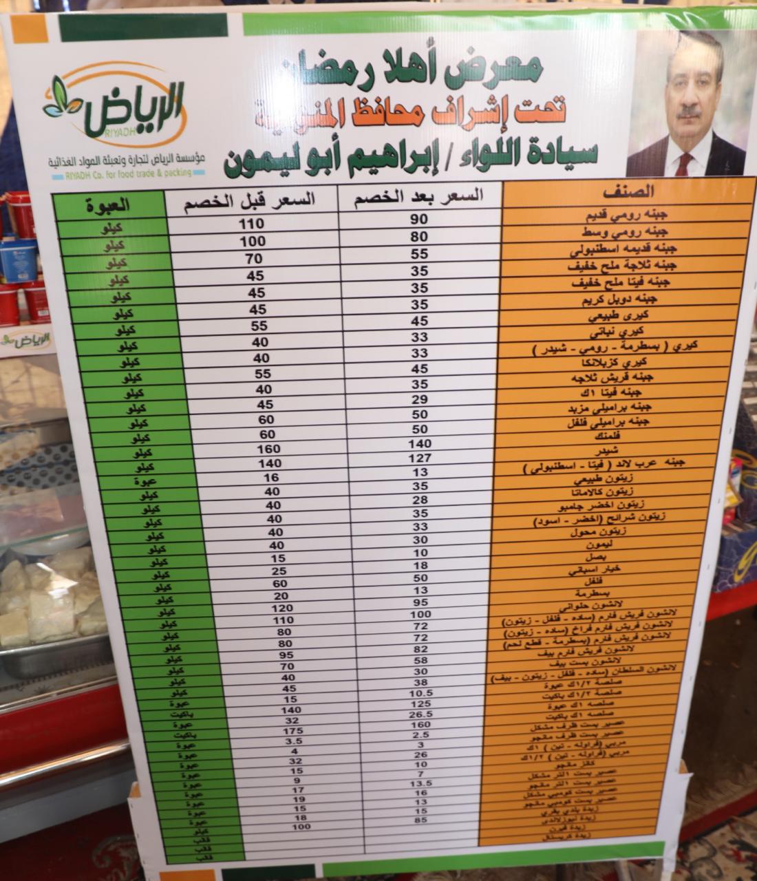 إفتتح اليوم اللواء إبراهيم أحمد أبو ليمون محافظ المنوفية معارض " أهلا رمضان " ومنافذ بيع اللحوم بمراكز شبين الكوم وقويسنا لبيع السلع الغذائية بأسعار مخفضة للمواطنين ومحاربة غلاء الأسعار وجشع التجار وذلك طوال شهر رمضان المبارك ، جاء ذلك بحضور المهندس محمد التركاوى وكيل وزارة الزراعة ، و أنس الدبى مدير عام التجارة الداخلية بمديرية التموين بالمحافظة والمحاسب خالد النمر رئيس مركز ومدينة قويسنا ، والأستاذ صفوت معوض رئيس حى شرق والأستاذ سمير عتريس رئيس حى غرب شبين الكوم.