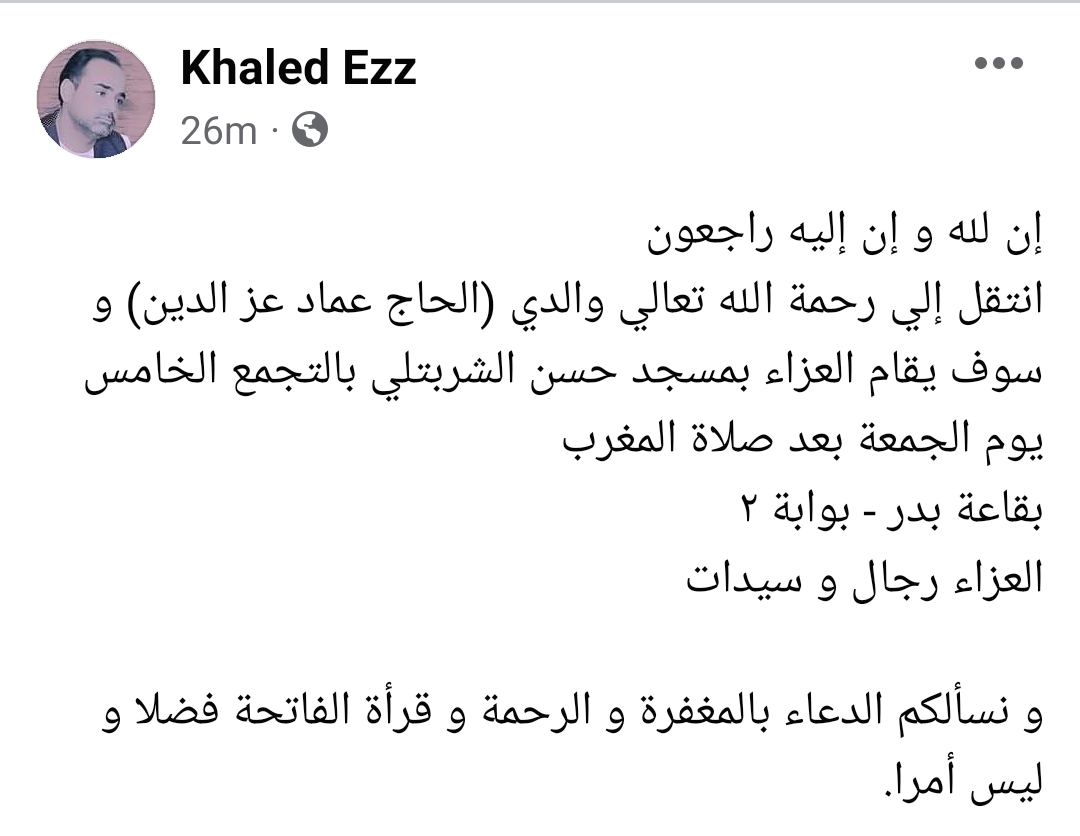 وعلق خالد عز "إن لله و إن إليه راجعون ، انتقل إلي رحمة الله تعالي والدي (الحاج عماد عز الدين) و سوف يقام العزاء بمسجد حسن الشربتلي بالتجمع الخامس يوم الجمعة بعد صلاة المغرب ، و نسألكم الدعاء بالمغفرة و الرحمة و قرأة الفاتحة فضلا و ليس أمرا".