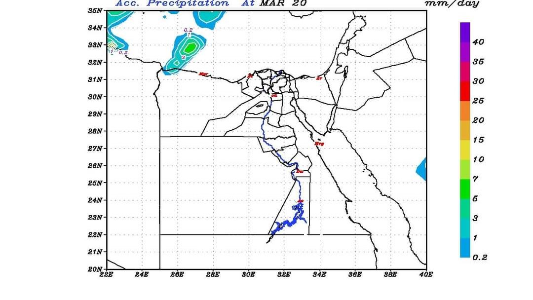 تشير نتائج نماذج التنبؤ بالإمطار بمركز التنبؤ بقطاع التخطيط وخرائط الامطار التابعة لوزارة الموارد المائية والرى، على جمهورية مصر العربية خلال الفترة من 20مارس إلى 22 مارس