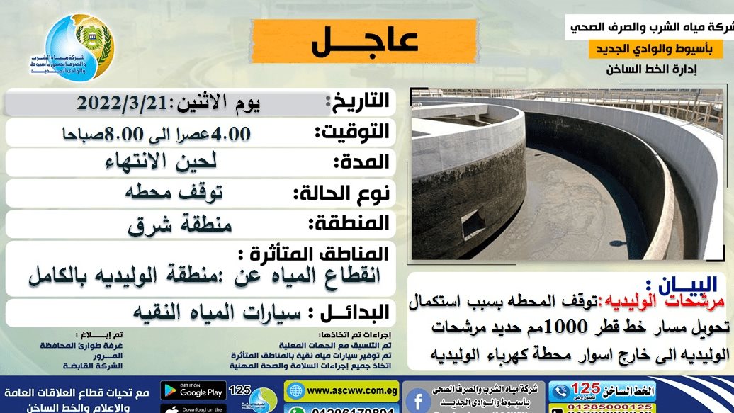 أعلنت شركة مياه الشرب والصرف الصحي بأسيوط والوادى الجديد، عن قطع المياه عن مناطق (الوليدية بالكامل _ شرق أسيوط - وقري بحري مركز أسيوط ) وذلك من الساعة 4 عصر اليوم الاثنين الموافق 21 مارس 2022م وحتى صباح الثلاثاء الموافق 22 مارس 2022م.