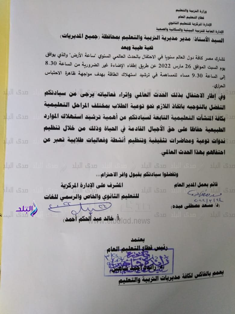 أصدرت وزارة التربية والتعليم والتعليم الفني تعليمات رسمية لجميع المديريات والادارات التعليمية والمدارس بمناسبة الاحتفال بالحدث العالمي السنوي ساعة الارض والذي يوافق 26 مارس 2022 من كل عام.