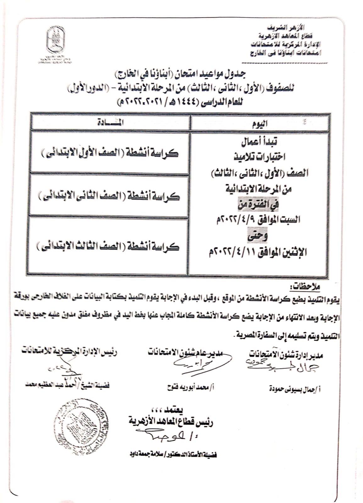 أعلن قطاع المعاهد الأزهرية، عن جداول امتحانات الدور الأول " أبناؤنا في الخارج" للدور الأول للعام الدراسي 2021/ 2022، للمرحلة الابتدائية للصف الأول،الثاني،الثالث الابتدائي.