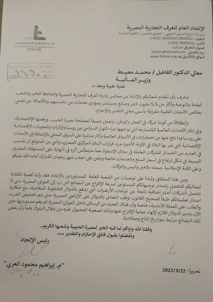 أرسل الاتحاد العام للغرف التجارية، برئاسة المهندس إبراهيم العربى، خطابا لوزير المالية محمد معيط، للمطالبة بتسريع الإفراج عن البضائع وعدم تكديسها في الجمارك مع دخول شهر رمضان وارتفاع الطلب المحلي، حتى لا ترتفع الأسعار بشكل أوسع بسبب نقص المعروض، خاصة بعد قرار البنك المركزي الخاص بفتح الاعتمادات المستندية.